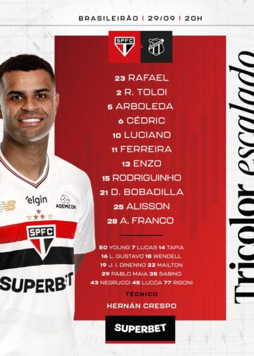 Eliminado da Libertadores pela LDU na última quinta-feira, em casa, o São Paulo tenta se reerguer com uma vitória no Brasileirão. O Tricolor Paulista recebe o Ceará, na segunda-feira (29), às 20h (Brasília), no Estádio do Morumbis, pela 25º rodada do Campeonato Brasileiro da Série A de 2025.