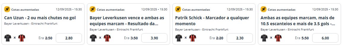 O Bayer Leverkusen é o favorito para o mercado, e o time ainda conta com um excelente retrospecto contra o Frankfurt, com 8 vitórias contra 2 frente aos rivais nos últimos dez jogos entre eles.